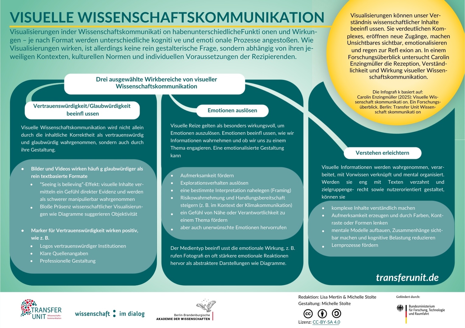Neben einer begrifflichen Einordnung und einer Übersicht verschiedener exemplarischer Formate der visuellen Wissenschaftskommunikation identifiziert Carolin Enzingmüller in dem Forschungsüberblick auch drei Wirkdimensionen: Verstehen erleichtern, Emotionen wecken sowie Vertrauenswürdigkeit und Glaubwürdigkeit beeinflussen. Diese werden in der Forschung besonders häufig adressiert und spielen für die Gestaltungspraxis eine zentrale Rolle.