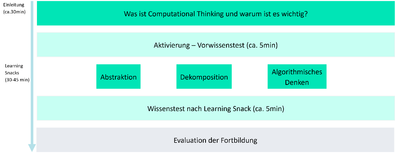 In der entwickelten Fortbildung erwerben die Lehrkräfte zum einen fachliches Wissen zu Computational Thinking und zum anderen die Kompetenz, wie und wofür dies in den eigenen Unterricht integriert werden kann. Somit wird wird die Idee eines um Aspekte des Computational Thinking "angereicherten" Programmierunterrichts entwickelt.