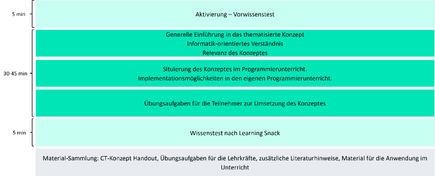 Der Kurs besteht aus einem einführenden Modul zu Computational Thinking und weiteren, individuellen Learning-Snacks zu den Konzepten Abstraktion, Dekomposition und algorithmisches Denken (s. Abbildung 1). Jeder Snack dauert maximal 45min und kann in eigener Geschwindigkeit bearbeitet werden. In den jeweiligen Snack wird das entsprechende Konzept vorgestellt, ihre Relevanz im Informatikunterricht verdeutlicht und Möglichkeiten vorgestellt, wie das jeweilige Konzept in den eigenen Unterricht integriert werden kann, zusätzlich werden auch kleine Übungsaufgaben bereitgestellt (s. Abbildung 2). Kontextualisiert werden die behandelten Inhalte mit Hilfe des Programmierens und so aufbereitet, das sie direkt, ohne viel Aufwand in den eigenen Unterricht angewendet werden können.